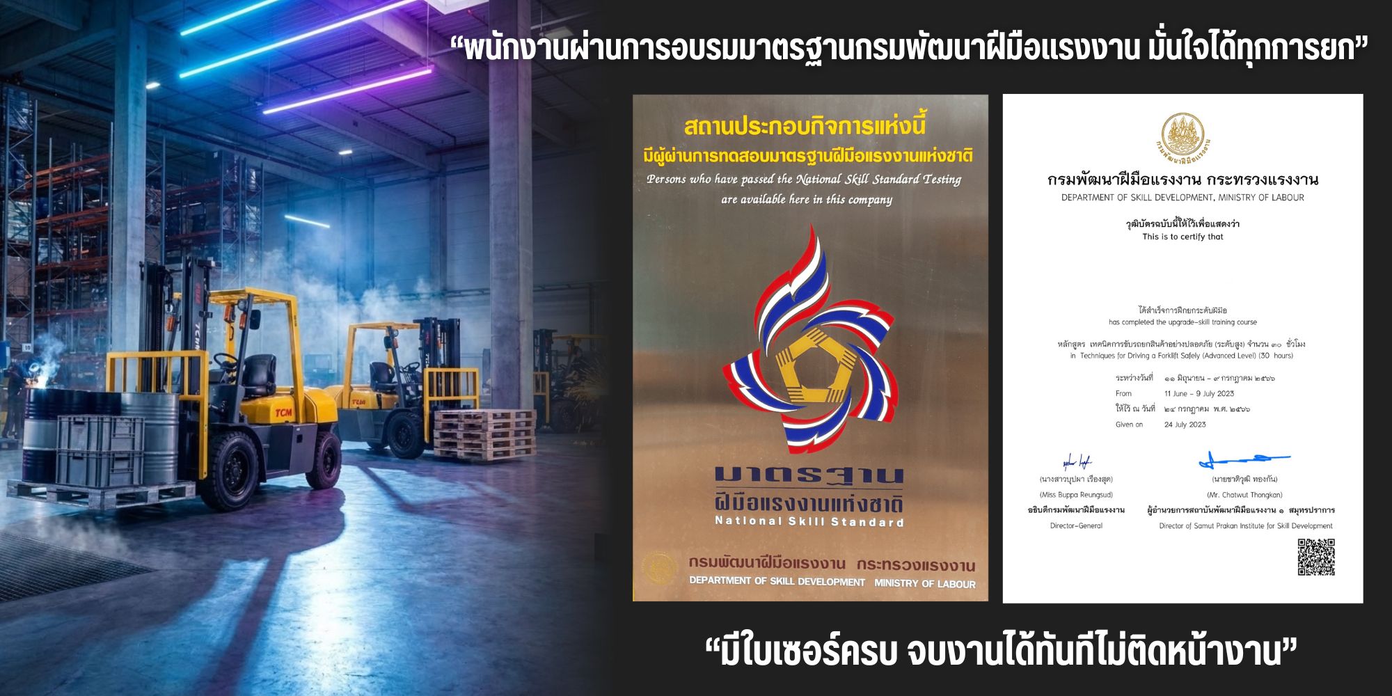 • มีใบรับรอง (Certificate): ผ่านการฝึกอบรมหลักสูตร "ยกระดับฝีมือ พนักงานควบคุมเครื่องจักรรถยก ระดับ 1 (30 ชั่วโมง)" จากกรมพัฒนาฝีมือแรงงาน